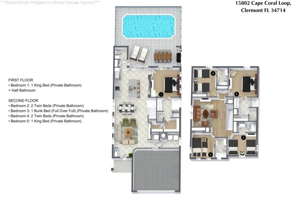 • Community: Windsor Cay • 5 Bedrooms/ 5.5 Bathrooms/ Sleeps 12 • Disney World® (8.3 miles) SeaWorld (18.5 miles) • Convention Center (19.6 miles) ICON Park (21.3 miles) • Universal Studios (22.3 miles) Epic Universe (21.3 miles) • Location: Cape Coral Loop, Clermont FL 34714 DETAILS • 2,611 sqft • Central AC • Washer & Dryer • Cable TV & Wi-Fi • Fully Equipped Kitchen • Towels & Linens Provided • Washcloths Are Not Provided • Family Room with Flat Screen TV • Hair Dryers, Iron & Ironing Board • Private Door Code for Each Guest Stay • Outdoor Patio Furniture with Sun Loungers • Pack 'n play/ High Chair (Free Upon Request) • Private Screened-in Pool + Child Safety Pool Fence - BEDROOM SETUP FIRST FLOOR • Bedroom 1: 1 King Bed (Private Bathroom) + Half Bathroom SECOND FLOOR • Bedroom 2: 2 Twin Beds (Private Bathroom) • Bedroom 3: 1 Bunk Bed (Full Over Full) (Private Bathroom) • Bedroom 4: 2 Twin Beds (Private Bathroom) • Bedroom 5: 1 King Bed (Private Bathroom) - USEFUL INFORMATION • CHECKING IN AND OUT - Check-in after 4:00 PM - Checkout before 10:00 AM • WINDSOR CAY PARKING - Parking is free. - 2 vehicles per unit in the driveway + 2 in the garage. - No parking on grass or blocking the sidewalks. - No parking on the street. (Since it is a new community, they will not enforce this rule until the signs are placed.) - Parking pass must be printed out and displayed on the dashboard. - Do not park in front of other homes, risk of vehicle being towed. - Commercial Vehicles, RV's, trailers, buses, golf carts or boats are not allowed. - Registered guests cannot share their parking passes with unregistered visitors. - Vehicle in violation of parking policy will be towed at the guest's expense. • THIS HOME IS SELF-CATERING We do provide a small welcome kit to get you started. Please stop by the nearest supermarket to gather any additional items you may need for the duration of your stay. • POOL HEAT - OPTIONAL 1-Cost: $35 per day. 2-Request 48 hours in advance. 3-Minimum: 2 consecutive days. 4-Temperature will not exceed 95F. 5-Heater works through HEAT EXCHANGE and WILL NOT WORK in cold weather. If you still would like to heat the pool during cold conditions and it does not reach the desired temperature, we will not be able to offer a refund. The pool heater pumps have a safety system that prevents overheating of the element when the pump is working overtime in cold weather. It automatically shuts off briefly until the pump can regain its functionality efficiently. Keep in mind this service is optional and may not be available at times. • BBQ RENTAL - OPTIONAL - Cost: $75 All Stay • TRASH DISPOSAL Please place trash in the plastic bin daily to keep a clean home. • HOUSEKEEPING There is no daily housekeeping service provided in the rental rate. Before check-in, the unit will be thoroughly cleaned and inspected by a professional cleaning company. Clean sheets and towels will be available in the unit. Mid-stay cleaning services during your stay can be requested for an additional fee. • ONLINE PURCHASE If the online seller uses USPS, it will not get delivered as the Post Office does not recognize vacation homes as regular addresses and the package will be returned back to the sender. Only UPS, DHL and FEDEX delivers them. In some resorts the packages are delivered to the clubhouse. Fees may apply. Some resorts may not accept them. Keep in mind we are not responsible for unexpected issues with your online purchases. If you have any questions, please contact us. • REEF CLUB - Windsor Cay Resort - Arcade - Lazy River - Fitness Center - Family Cabanas - 9-Hole Mini Golf - Dual Water Slides - Gated Community - Volleyball & Cornhole - Children's Splash Pad - Outdoor Covered Bar - Blue Lagoon Bar & Grille - Resort-Style Zero-Entry Pool Resort registration needed. PLEASE NOTE: Additional charges apply when the owner has to fix something or pay for additional cleaning if not complied.