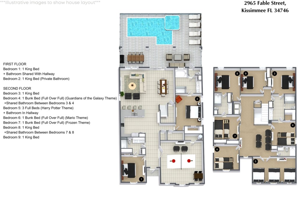 • Community: Storey Lake • 9 Bedrooms/ 5 Bathrooms/ Sleeps 28 • Disney World® (4.1 miles) SeaWorld (7.3 miles) • Convention Center (8.4 miles) ICON Park (10.1 miles) • Universal Studios (11.2 miles) Epic Universe (11.8 miles) • Location: Fable Street, Kissimmee FL 34746 DETAILS • 4,303 sqft • Lake View • Central AC • Washer & Dryer • Cable TV & Wi-Fi • TV In Every Bedroom • Fully Equipped Kitchen • Towels & Linens Provided • Washcloths Are Not Provided • Family Room with Flat Screen TV • Hair Dryers, Iron & Ironing Board • Private Door Code for Each Guest Stay • Outdoor Patio Furniture with Sun Loungers • Pack 'n play/ High Chair (Free Upon Request) • Private Screened-in Pool + Child Safety Pool Fence - BEDROOM SETUP FIRST FLOOR Bedroom 1: 1 King Bed + Bathroom Shared With Hallway Bedroom 2: 1 King Bed (Private Bathroom) SECOND FLOOR Bedroom 3: 1 King Bed Bedroom 4: 1 Bunk Bed (Full Over Full) (Guardians of the Galaxy Theme) +Shared Bathroom Between Bedrooms 3 & 4 Bedroom 5: 3 Full Beds (Harry Potter Theme) + Bathroom In Hallway Bedroom 6: 1 Bunk Bed (Full Over Full) (Mario Theme) Bedroom 7: 1 Bunk Bed (Full Over Full) (Frozen Theme) Bedroom 8: 1 King Bed +Shared Bathroom Between Bedrooms 7 & 8 Bedroom 9: 1 King Bed - USEFUL INFORMATION • CHECKING IN AND OUT - Check-in after 4:00 PM - Checkout before 10:00 AM • PARKING - Parking is free. - No street parking. - No parking on the grass. - No parking or blocking the sidewalk. - Vehicle in violation of parking policy will be towed at the guest's expense. - Commercial vehicles, RV's, Trailers, Buses, Golf carts, recreational vehicles or watercraft is not permitted at Storey Lake. - The community allows up to 10 cars to enter the resort per unit. There are overflow parking spaces, but not guaranteed as they are not assigned nor reserved. • THIS HOME IS SELF-CATERING We do provide a small welcome kit to get you started. Please stop by the nearest supermarket to gather any additional items you may need for the duration of your stay. • POOL HEAT - OPTIONAL 1-Cost: $35 per day. 2-Request 48 hours in advance. 3-Minimum: 2 consecutive days. 4-Temperature will not exceed 95F. 5-Attached spa is NOT a hot tub. It can only be heated if the entire pool is heated. Both have the same temperature. It does not have jets. 6-Heater works through HEAT EXCHANGE and WILL NOT WORK in cold weather. If you still would like to heat the pool during cold conditions and it does not reach the desired temperature, we will not be able to offer a refund. The pool heater pumps have a safety system that prevents overheating of the element when the pump is working overtime in cold weather. It automatically shuts off briefly until the pump can regain its functionality efficiently. Keep in mind this service is optional and may not be available at times. • BBQ RENTAL - OPTIONAL - Cost: $75 All Stay • HOUSEKEEPING There is no daily housekeeping service provided in the rental rate. Before check-in, the unit will be thoroughly cleaned and inspected by a professional cleaning company. Clean sheets and towels will be available in the unit. Mid-stay cleaning services during your stay can be requested for an additional fee. • TRASH DISPOSAL Please dispose the trash daily in the plastic bench to keep a clean home. • ONLINE PURCHASE If the online seller uses USPS, it will not get delivered as the Post Office does not recognize vacation homes as regular addresses and the package will be returned back to the sender. Only UPS, DHL and FEDEX delivers them. In some resorts the packages are delivered to the clubhouse. FEES MAY APPLY. Some resorts may not accept them. Keep in mind we are not responsible for unexpected issues with your online purchases. If you have any questions, please contact us. • HIDEAWAY CLUB - Storey Lake Phase 1 Spa Lounge Hot Tub Tiki Bar Lazy River Restaurant Waterslides Splash Park Kayak Rental Fitness Center Gated Community Basketball Court Beach Volleyball Lagoon Style Pool Huge Resort-Style Pool 9-Hole Mini Golf Course (*Fee Required) • THE BRONSON CLUB - Storey Lake Phase 3 Clubhouse Lazy River Playground Game Room Lounge Area Fitness Center Gated Community Basketball Court Resort-Style Swimming Pool Free ride to resort guests during clubhouse hours. PLEASE NOTE: Additional charges apply when the owner has to fix something or pay for additional cleaning if not complied.