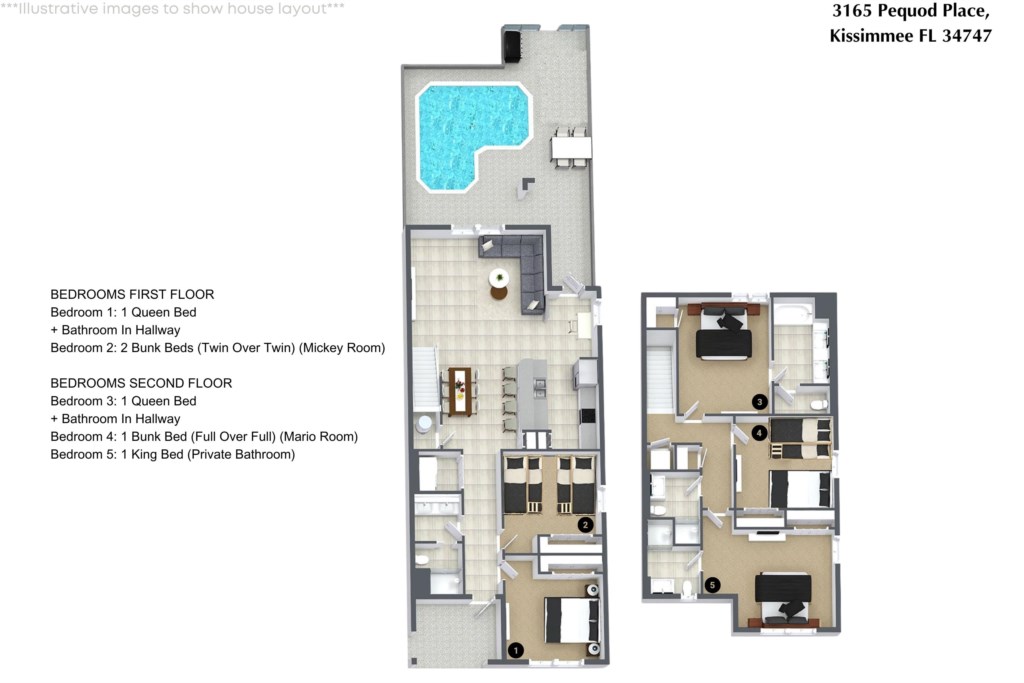 • Community: Storey Lake • 5 Bedrooms/ 4 Bathrooms/ Sleeps 14 • Disney World® (4.8 miles) SeaWorld (8.0 miles) • Convention Center (9.1 miles) ICON Park (10.7 miles) • Universal Studios (11.8 miles) Epic Universe (11.3 miles) • Location: Pequod Place, Kissimmee, FL 34747 DETAILS • 2,128 sqft • Central AC • Washer & Dryer • Cable TV & Wi-Fi • TV In Every Bedroom • Fully Equipped Kitchen • Towels & Linens Provided • Washcloths Are Not Provided • Family Room with Flat Screen TV • Hair Dryers, Iron & Ironing Board • Private Door Code for Each Guest Stay • Outdoor Patio Furniture with Sun Loungers • Pack 'n play/ High Chair (Free Upon Request) • Private Screened-in Pool + Child Safety Pool Fence - BEDROOM SETUP FIRST FLOOR Bedroom 1: 1 Queen Bed + Bathroom In Hallway Bedroom 2: 2 Bunk Beds (Twin Over Twin) (Mickey Theme) SECOND FLOOR Bedroom 3: 1 Queen Bed + Bathroom In Hallway Bedroom 4: 1 Bunk Bed (Full Over Full) (Mario Theme) Bedroom 5: 1 King Bed (Private Bathroom) - USEFUL INFORMATION • CHECKING IN AND OUT - Check-in after 4:00 PM - Checkout before 10:00 AM • STOREY LAKE PARKING - Parking is free. - No street parking. - No parking on the grass or blocking the sidewalk. - The community allows up to 10 cars to enter the resort per unit. There are overflow parking spaces, but not guaranteed as they are not assigned nor reserved. - Commercial vehicles, RVs, trailers, buses, golf carts, recreational vehicles or watercraft are not permitted. - Vehicle in violation of parking policy will be towed at the guest's expense. • THIS HOME IS SELF-CATERING We do provide a small welcome kit to get you started. You can stop by the nearest supermarket to gather any additional items you may need for the duration of your stay. Please bring your own washcloths as we only provide towels. • POOL HEAT - OPTIONAL 1-Cost: $35 per day. 2-Request 48 hours in advance. 3-Minimum: 2 consecutive days. 4-Temperature will not exceed 95F. 5-Heater works through HEAT EXCHANGE and WILL NOT WORK in cold weather. If you still would like to heat the pool during cold conditions and it does not reach the desired temperature, we will not be able to offer a refund. The pool heater pumps have a safety system that prevents overheating of the element when the pump is working overtime in cold weather. It automatically shuts off briefly until the pump can regain its functionality efficiently. Keep in mind this service is optional and may not be available at times. • BBQ RENTAL - OPTIONAL - Cost: $75 All Stay • HOUSEKEEPING There is no daily housekeeping service provided in the rental rate. Before check-in, the unit will be thoroughly cleaned and inspected by a professional cleaning company. Clean sheets and towels will be available in the unit. Mid-stay cleaning services during your stay can be requested for an additional fee. • TRASH DISPOSAL Please dispose the trash daily in the plastic bench to keep a clean home. • ONLINE PURCHASE If the online seller uses USPS, it will not get delivered as the Post Office does not recognize vacation homes as regular addresses and the package will be returned back to the sender. Only UPS, DHL and FEDEX delivers them. In some resorts the packages are delivered to the clubhouse. FEES MAY APPLY. Some resorts may not accept them. Keep in mind we are not responsible for unexpected issues with your online purchases. If you have any questions, please contact us. • HIDEAWAY CLUB - Storey Lake Phase 1 - Spa - Lounge - Hot Tub - Tiki Bar - Lazy River - Restaurant - Waterslides - Splash Park - Kayak Rental - Fitness Center - Gated Community - Basketball Court - Beach Volleyball - Lagoon Style Pool - Huge Resort-Style Pool - 9-Hole Mini Golf Course (*Fee Required) • THE BRONSON CLUB - Storey Lake Phase 3 - Lazy River - Playground - Game Room - Lounge Area - Fitness Center - Gated Community - Basketball Court - Resort-Style Swimming Pool Free ride to resort guests during clubhouse hours. PLEASE NOTE: Additional charges apply when the owner has to fix something or pay for additional cleaning if not complied.